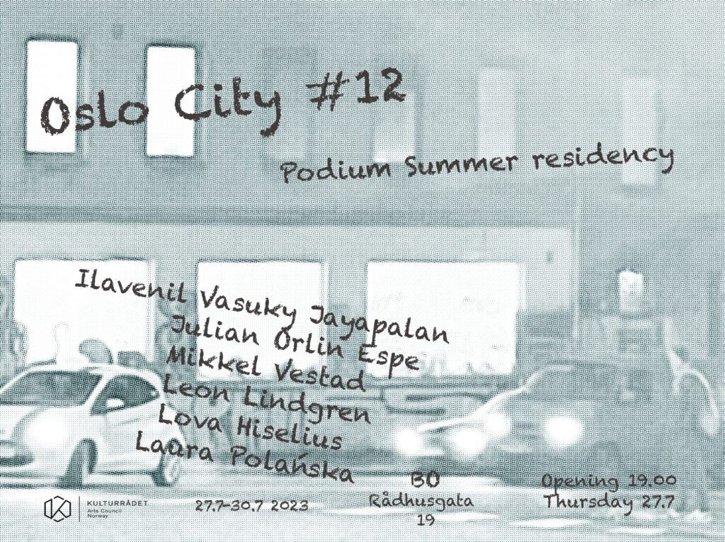 Ilavenil Vasuky Jayapalan, Julian Orlin Espe, Mikkel Vestad, Leon Lindgren, Lova Hiselius og Laura Polanska er hver for seg tildelt plass på det kunstnerdrevne visningsrommet podiums sommerresidens. I regi av den kuratoriske plattformen Oslo City har de over en måned jobbet sammen mot en felles utstilling som vises på BO 27. til 30. juli.